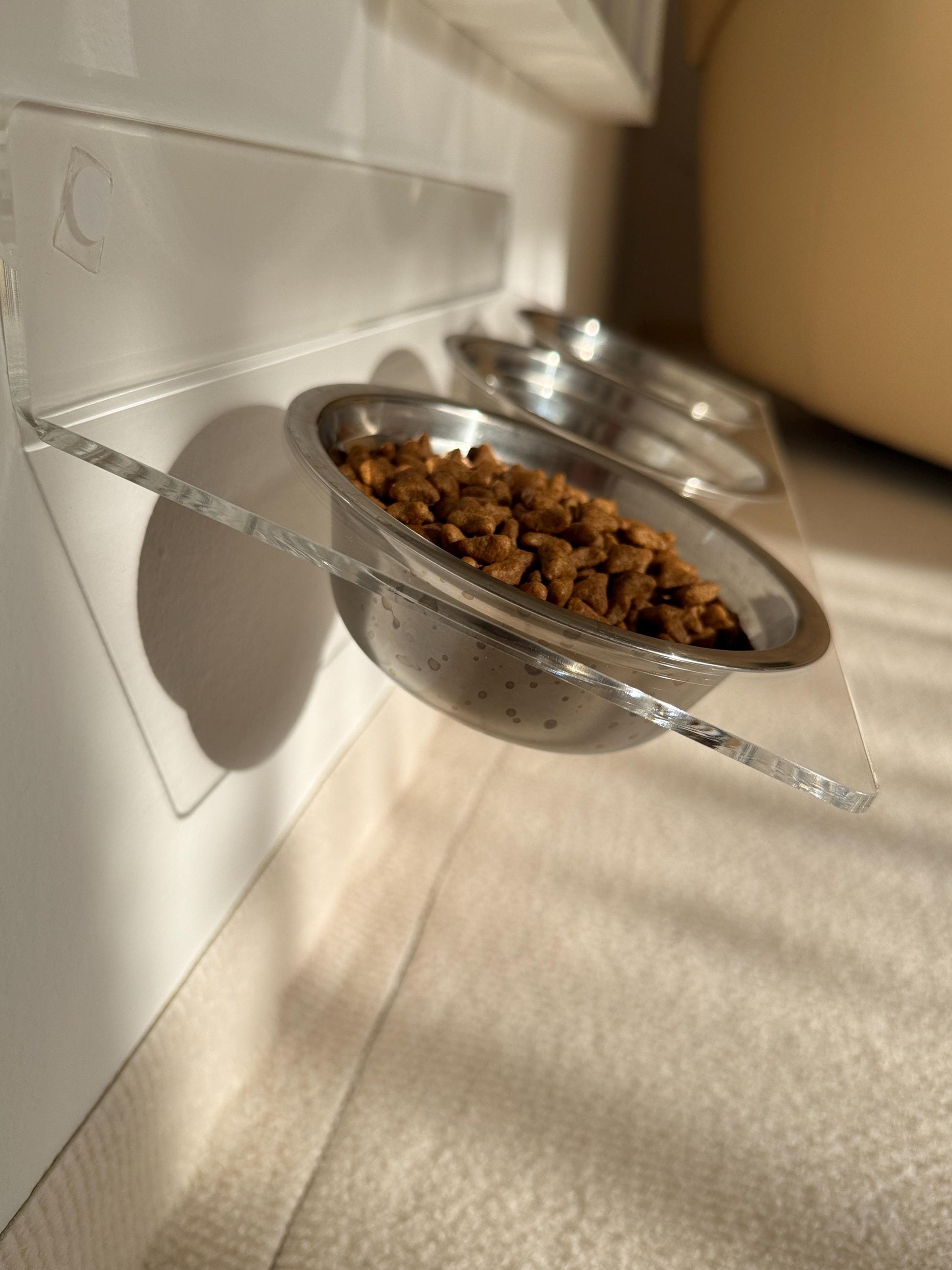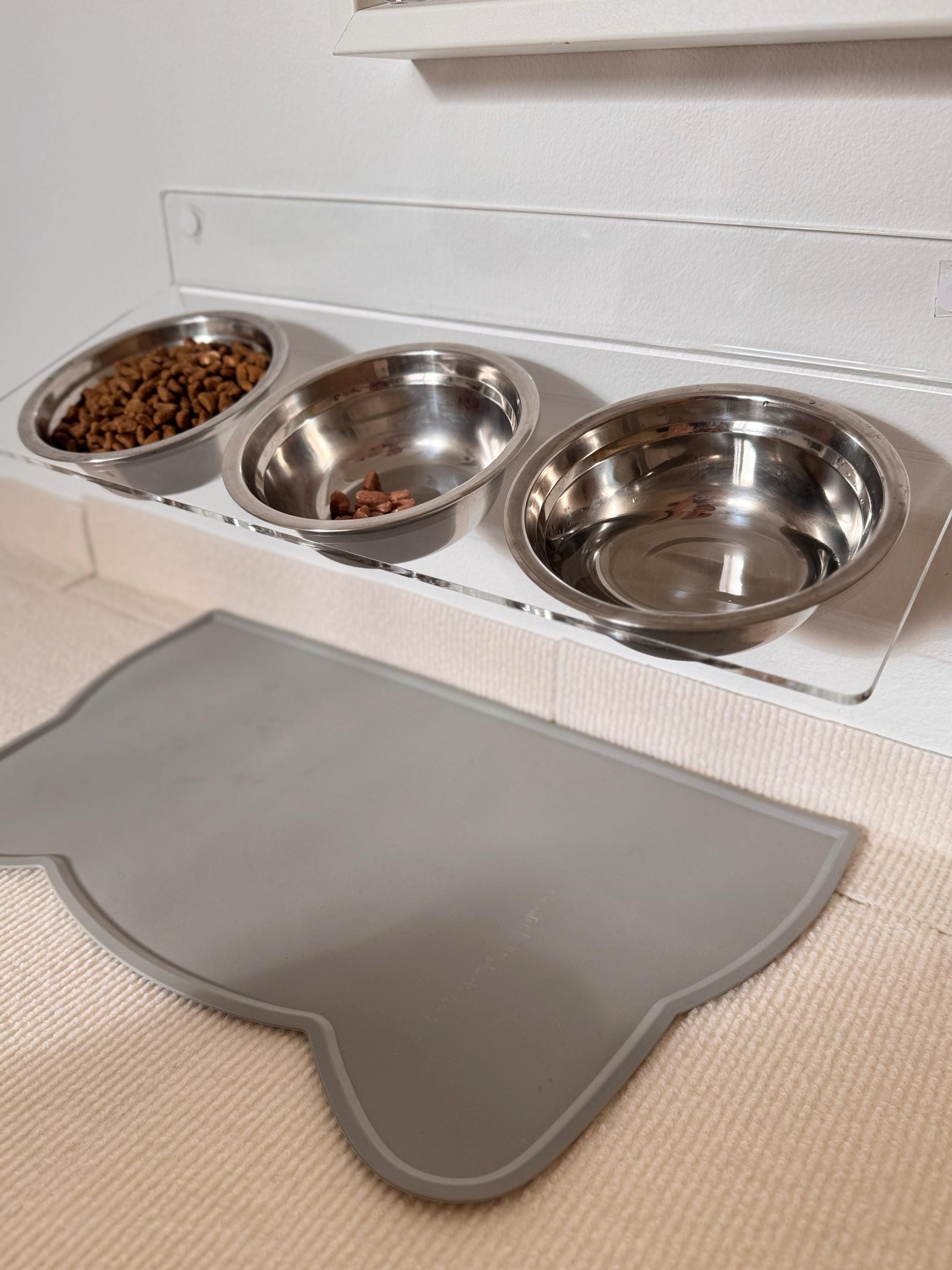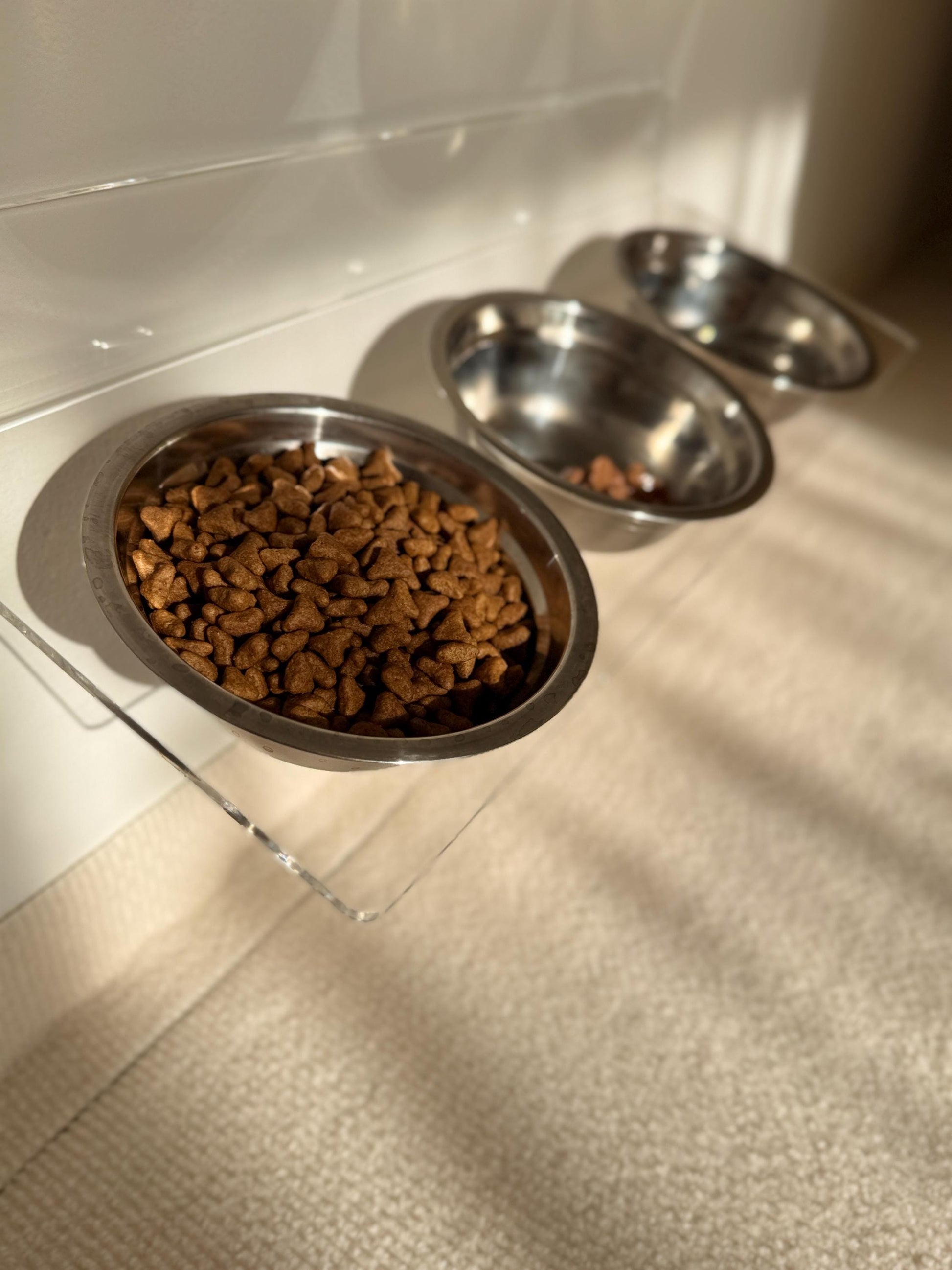 Acrylic Tilted Triple Pet Bowl Shelf 75. Wall Mounted Feeder. 3 Cat Bowls. Clear Floating Shelf. Modern Pet Furniture. Drill or Adhesive