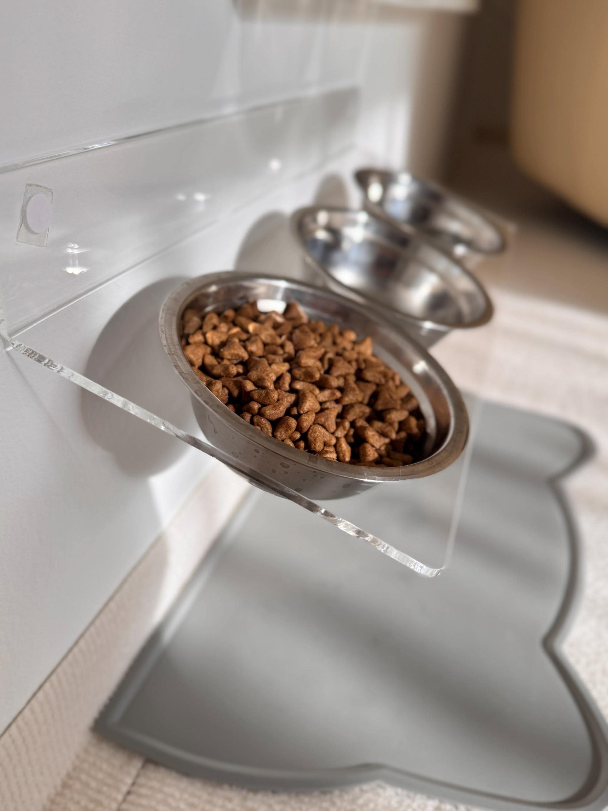 Made from crystal-clear acrylic, this 3-bowl wall-mounted feeder blends seamlessly with modern, minimalist, or Scandinavian décor. It frees floor space, creates a clean feeding area, and looks absolutely stunning on the wall.