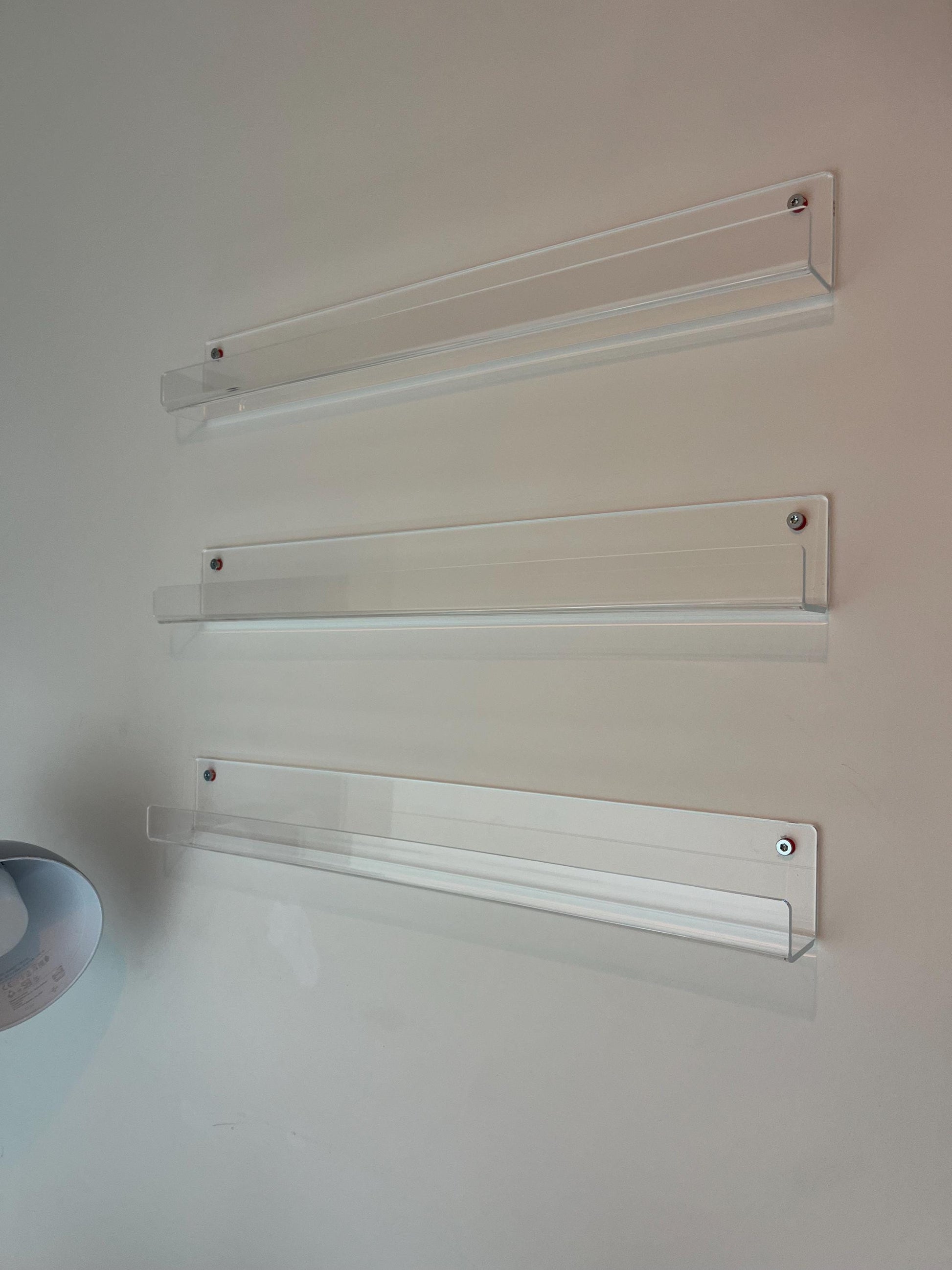 Showcase your favorite collectibles with this set of 3 clear narrow acrylic shelves perfect for mini figures, Funko collections, trading cards, comics, small decor, and more.
