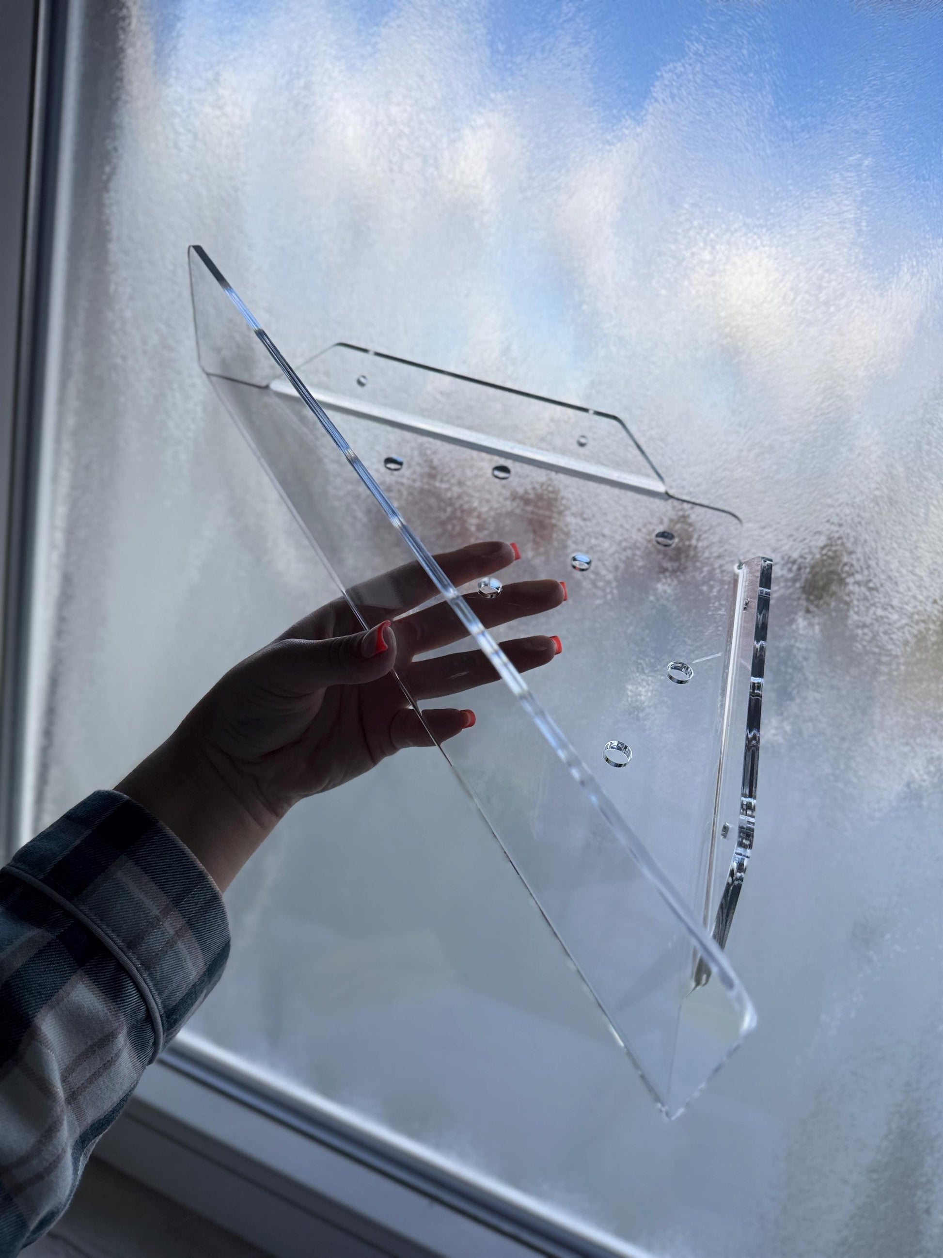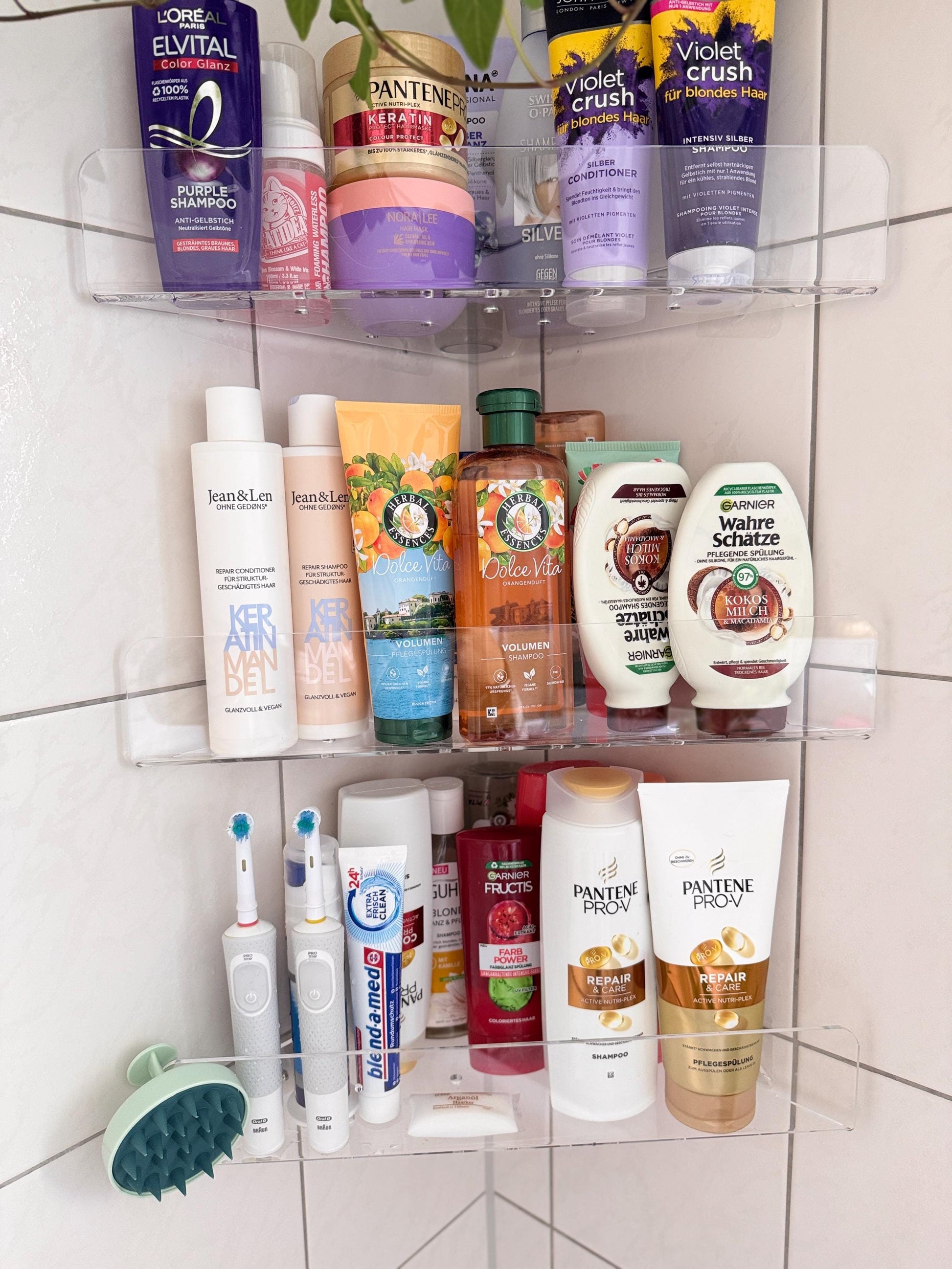 Upgrade your bathroom with this modern set of large acrylic corner shower shelves. Designed for a clean, minimalist look, these transparent shelves keep your shower organized without drilling or damaging your tiles.